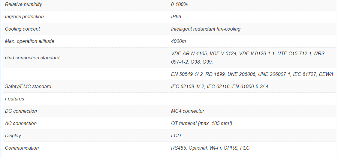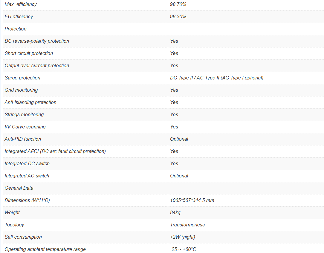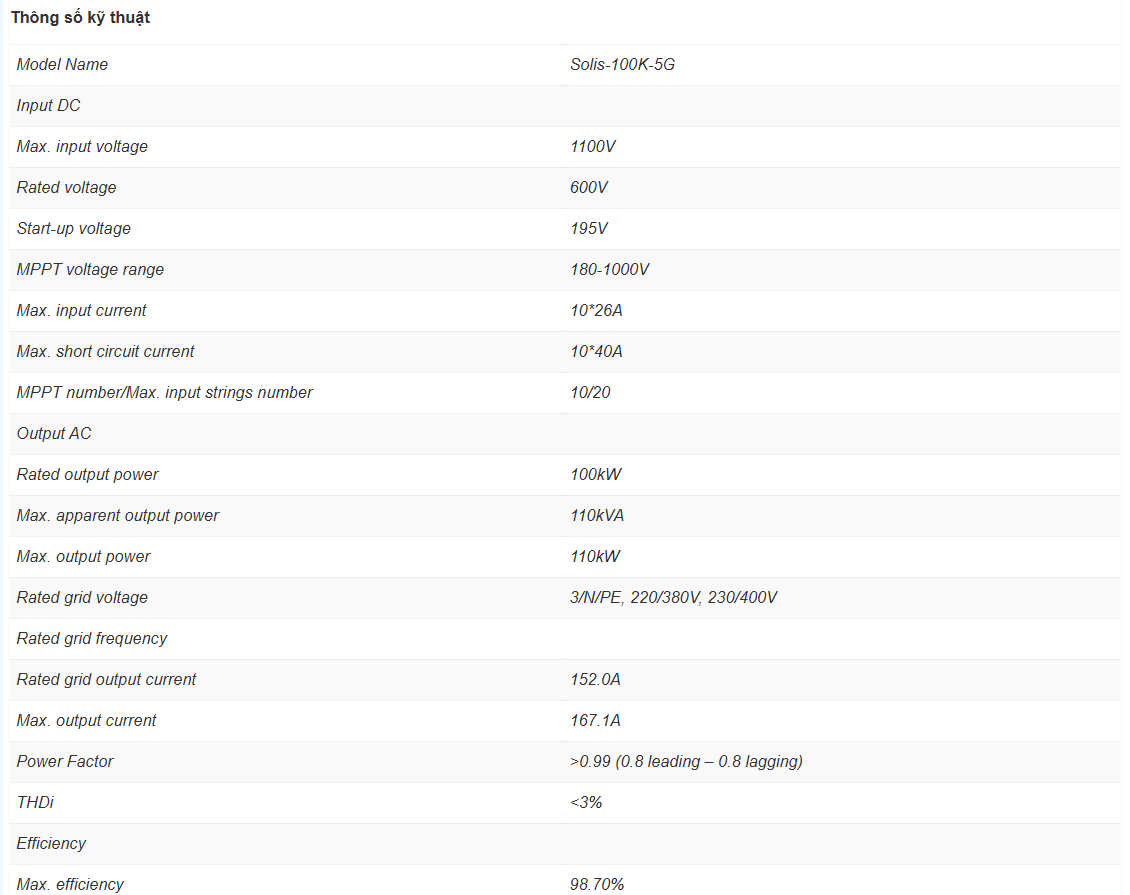 Inverter hòa lưới Solis-100K-5G 100kW 3 Pha 380V được thiết kế với 10 MPPT để cấu hình linh hoạt hơn với tốc độ cao, tác động môi trường nhỏ hơn và hiệu suất tạo cao hơn. Tối đa 13A mỗi chuỗi, khả năng quá tải đến 150%, Chức năng chuyển đổi DC và quét IV thông minh