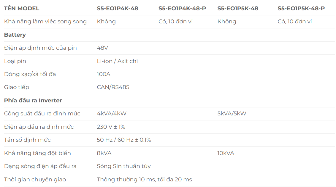 Thông số kỹ thuật của biến tần độc lập Solis 5KW S5-EO1P5K-48