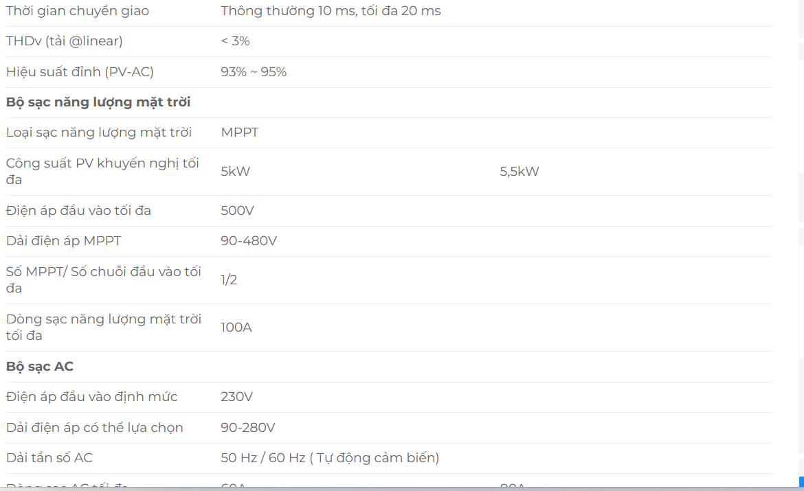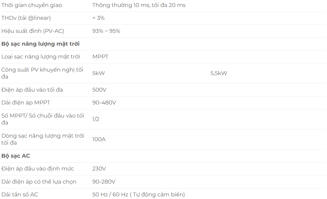 • Ưu tiên đầu vào AC/Năng lượng mặt trời có thể định cấu hình dựa trên các ứng dụng