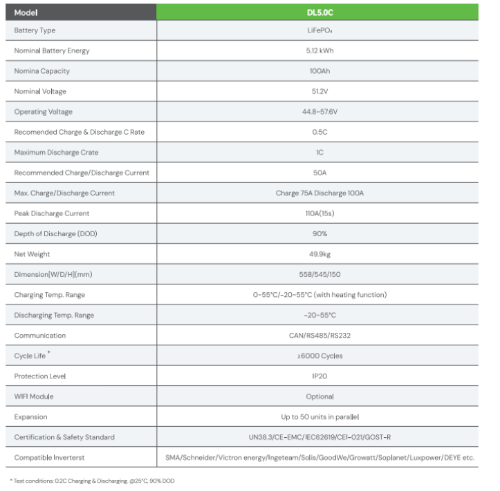 Pin lưu trữ điện LFP Dyness DL5.0C được thiết kế cho các ứng dụng dân dụng và thương mại nhỏ, với tối đa 50 đơn vị song song và phạm vi năng lượng từ 5,12 kWh đến 256 kWh. Nó hỗ trợ tốc độ xả 1C. Với thời gian chu kỳ cao và tuổi thọ dài, nó đảm bảo mức tiêu thụ điện không phải lo lắng.